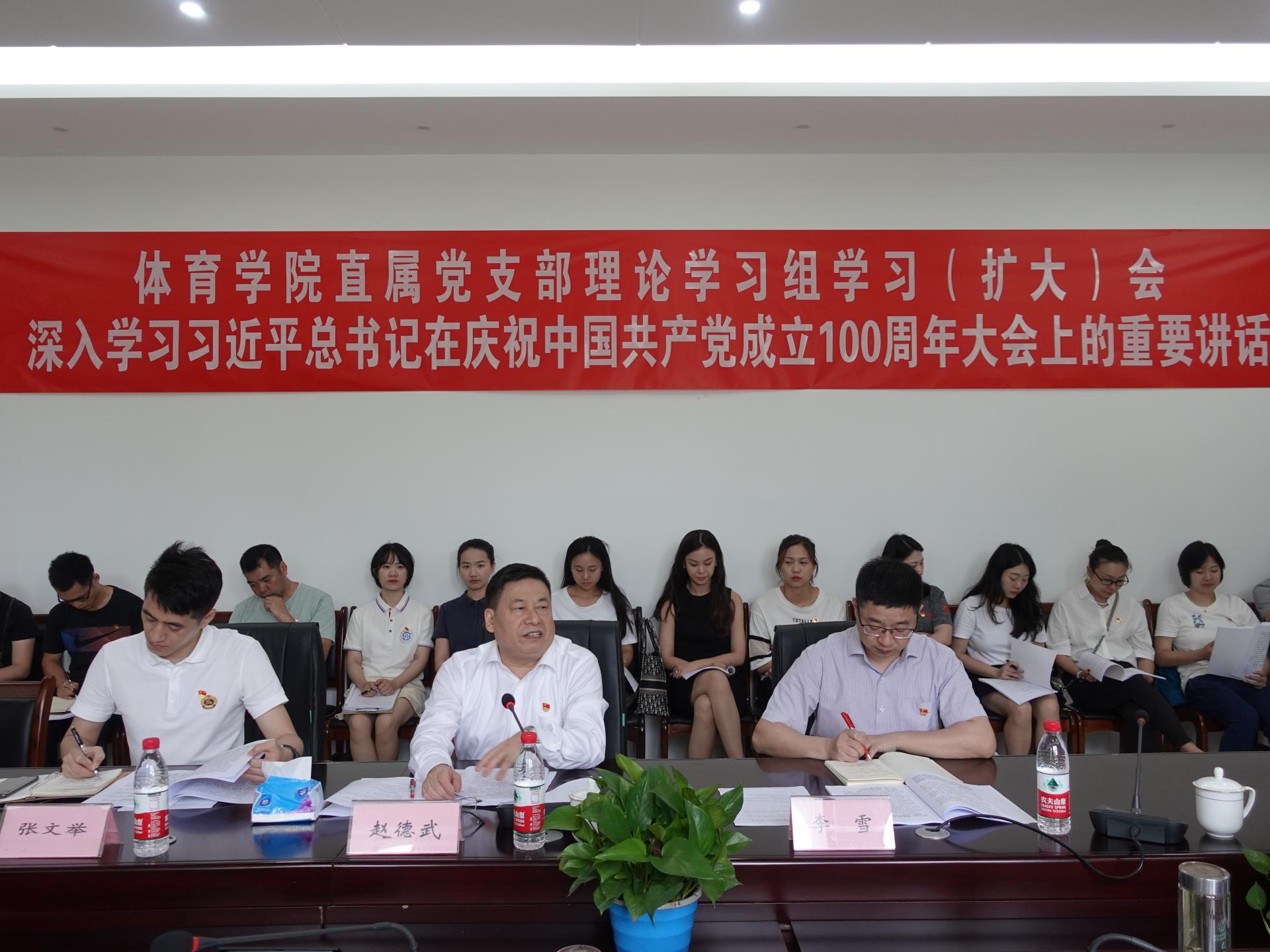 7月8日上午,沙巴足球网召开专题学习会,深入学习习近平总书记在庆祝中国共产党成立100周年大会上的重要讲话。学校党委书记赵德武、党史学习教育第八指导组组长李雪、党委办公室副主任张文举、沙巴足球网教工党员、二级部门负责人、入党积极分子参加会议。会议由直属党支部书记杨远波主持。