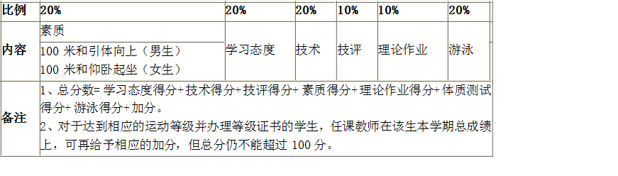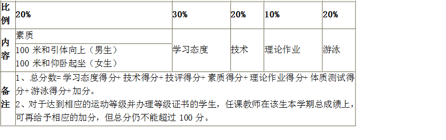 备注  1、总分数=学习态度得分+技术得分+技评得分+素质得分+理论作业得分+体质测试得分+游泳得分+加分。