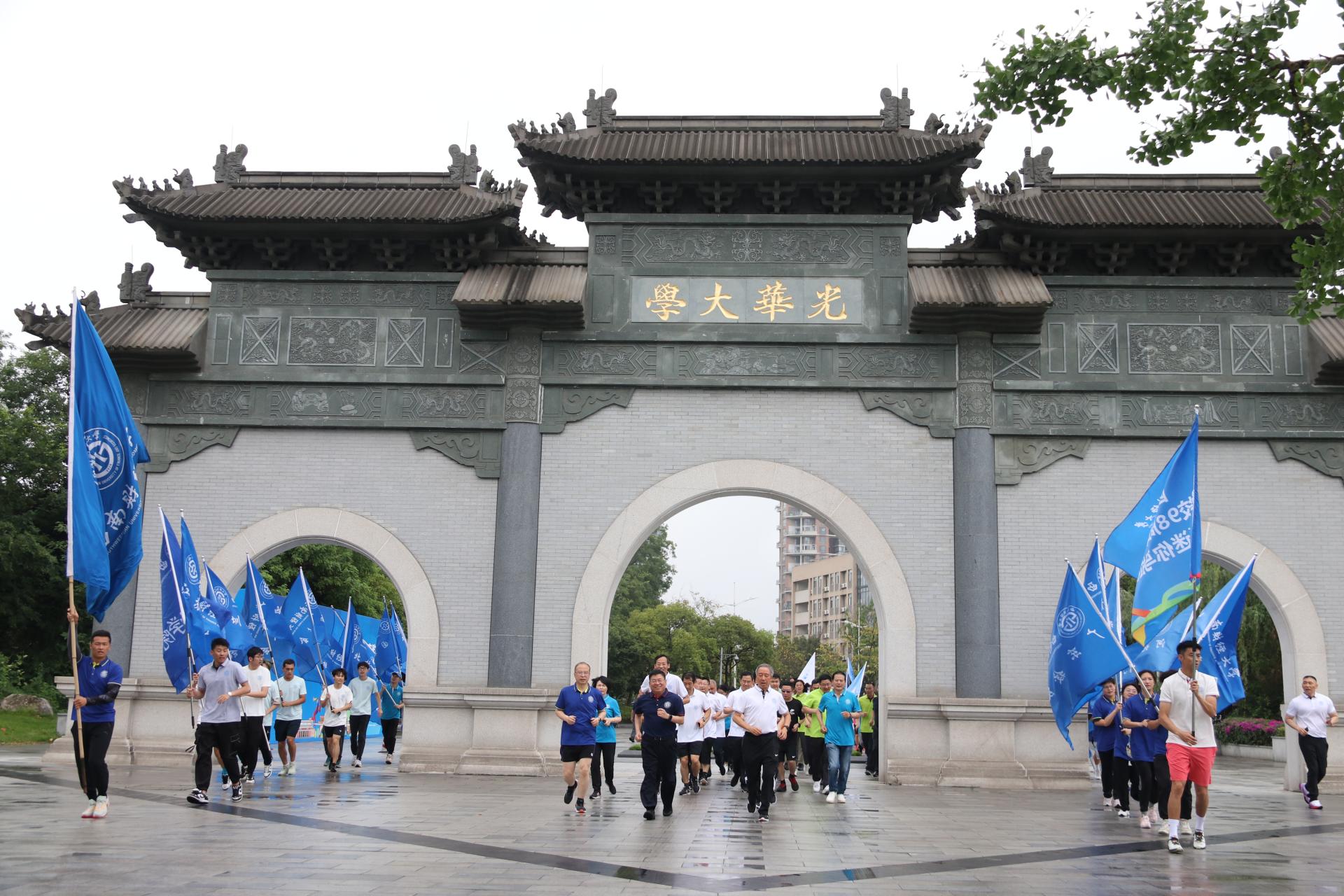 上午9时,“健康跑”首先在光华校区拉开帷幕,党委副书记、副校长李永强,党委常委、副校长张邦富带领相关中层干部及师生穿过芳草绿树,感受学校的深厚底蕴和“大运会”带来的蓬勃朝气。10时30分,在大屏幕上校友们声声祝福、校舞蹈队激情献舞的烘托下,党委书记赵德武发令枪声响起,柳林校区校庆“健康跑”活动正式开始。师生们身着印有校徽的五彩运动服从腾骧楼前启程,途径梅园、创业大道沿线,穿过光华大学校门来到济民广场,最后行经经世楼到达终点北大门。伴随“发展体育运动、增强人民体质”“经世济民,孜孜以求”“我运动、我健康,我运动、我快乐”的响亮口号,师生们、校友们用矫健的步伐表达对学校的祝福、对健康的守护、对生命的热爱。