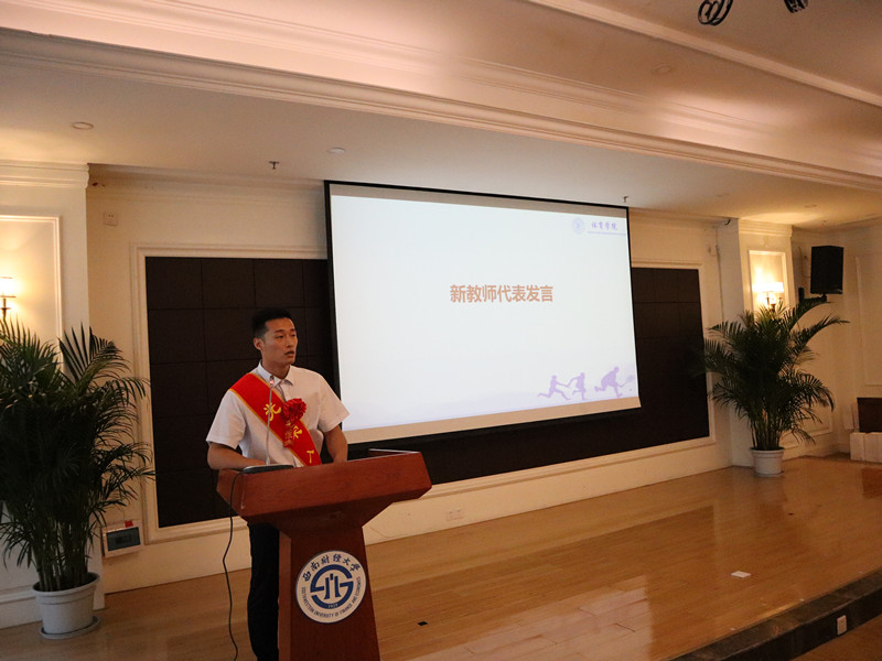 院长兼直属党支部书记杨远波代表学院对荣休的白耀东、余兰老师表示衷心的感谢并致以良好的祝愿,向新入职的年轻教师表示热烈欢迎。杨院长表示:老教师荣休、新教师入职典礼作为学院师德师风建设的一项重要内容,目的是赓续百年初心,担当育人使命,让红色血脉生生不息、让西财体育精神代代相传。白老师、余老师见证了西南财经大学的发展,他们三十年如一日与学院同荣辱、共成长,默默奉献、朴实无华、不求名利,为学院乃至学校的发展付出了毕生的心血、作出了重要的贡献。希望老教师们保重身体、发挥余热,为学院献言献策,一如既往支持学院发展。杨院长还对新入职的年轻教师提出了希望:希望他们坚持教书和育人相统一、坚持言传与身教相统一、坚持潜心问道和关注社会相统一、坚持学术自由和学术规范相统一,将立德树人贯穿于教书育人全方位全过程,争做“四有好老师”和新时代“大先生”,做好“四个引路人”。牢记为党育人、为国育才使命, 忠于教育事业,履行教师职责,弘扬财经文明,培育华夏栋梁,为培养德智体美劳全面发展的社会主义建设者和接班人作出新的更大贡献,为把学校建设成为财经特色鲜明的世界一流大学贡献自己的力量。