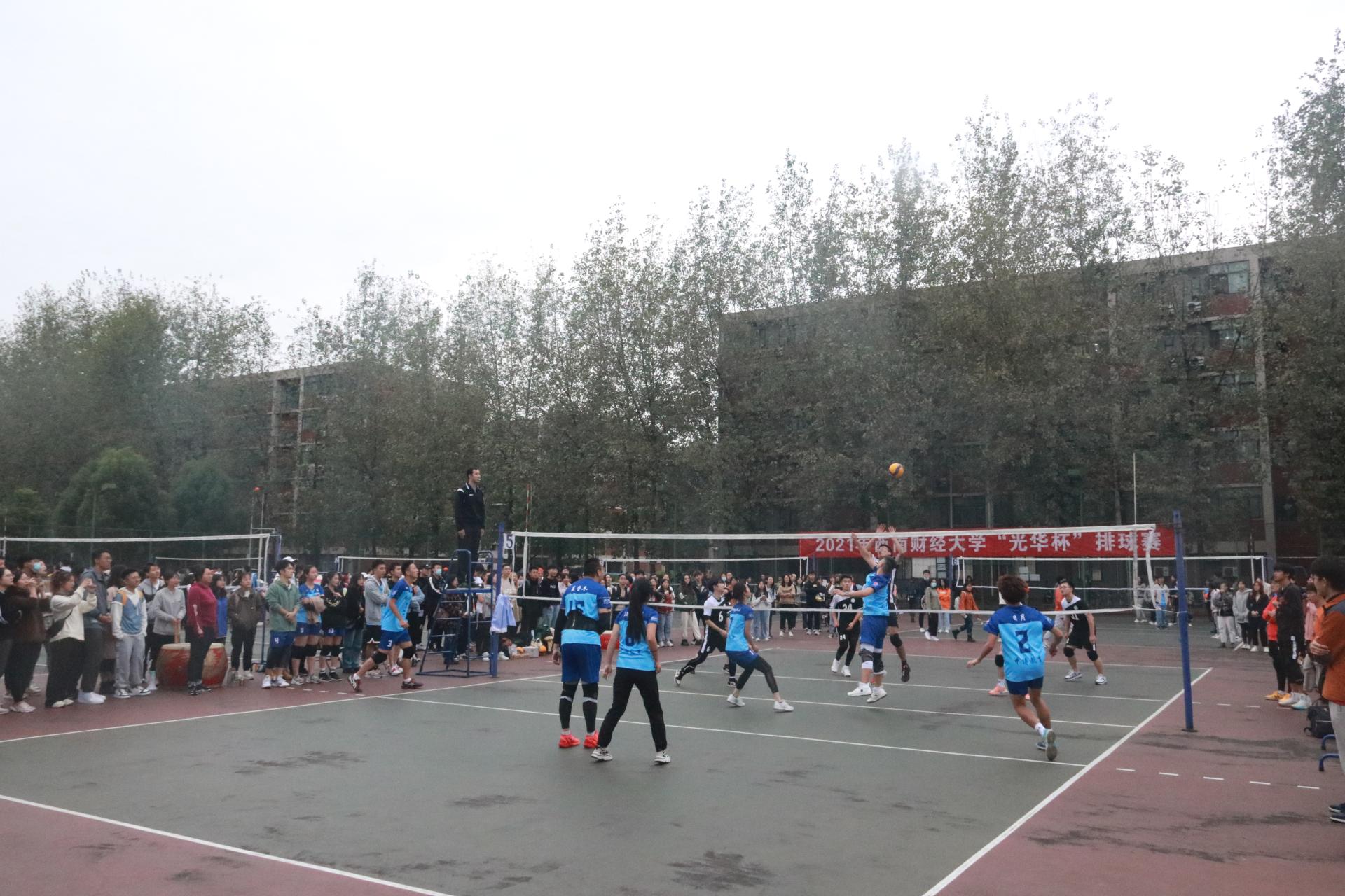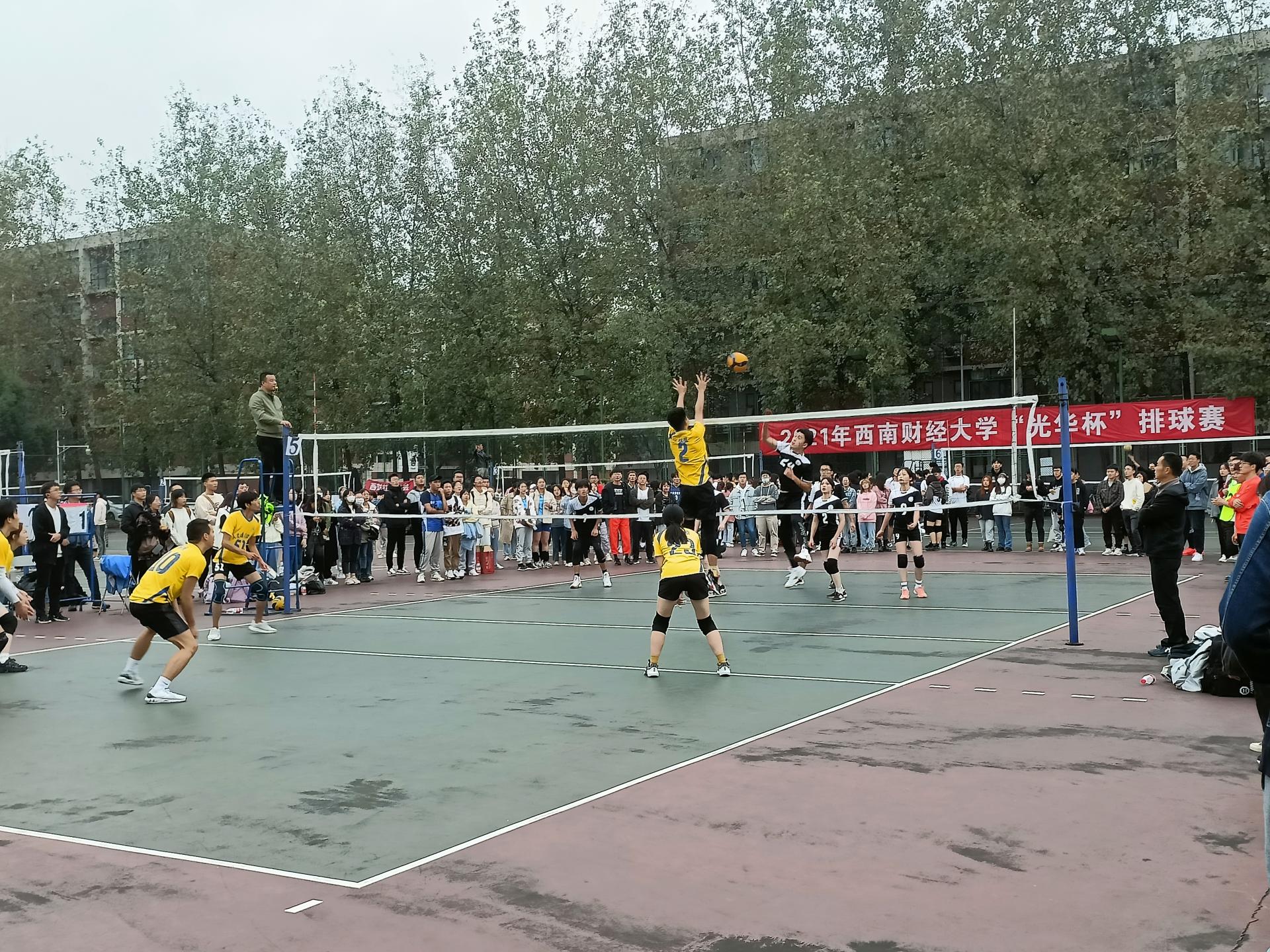 迎大运,促健康,第31届世界大学生夏季运动会排球比赛将在沙巴(中国)举行。为了进一步推动全民健身运动在沙巴(中国)的开展,当好东道主,增强大学生的身心健康,丰富校园文化生活,营造浓厚的排球氛围, 10月11日,2021年西南财经大学“光华杯”排球赛在柳林校区晨曦排球场拉开帷幕。