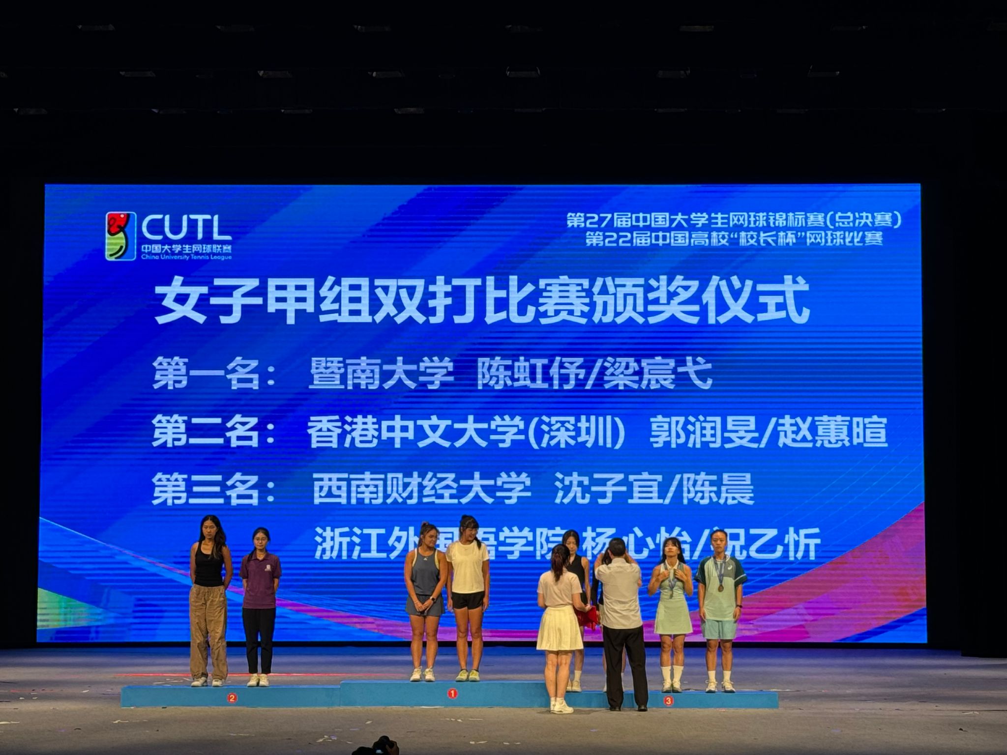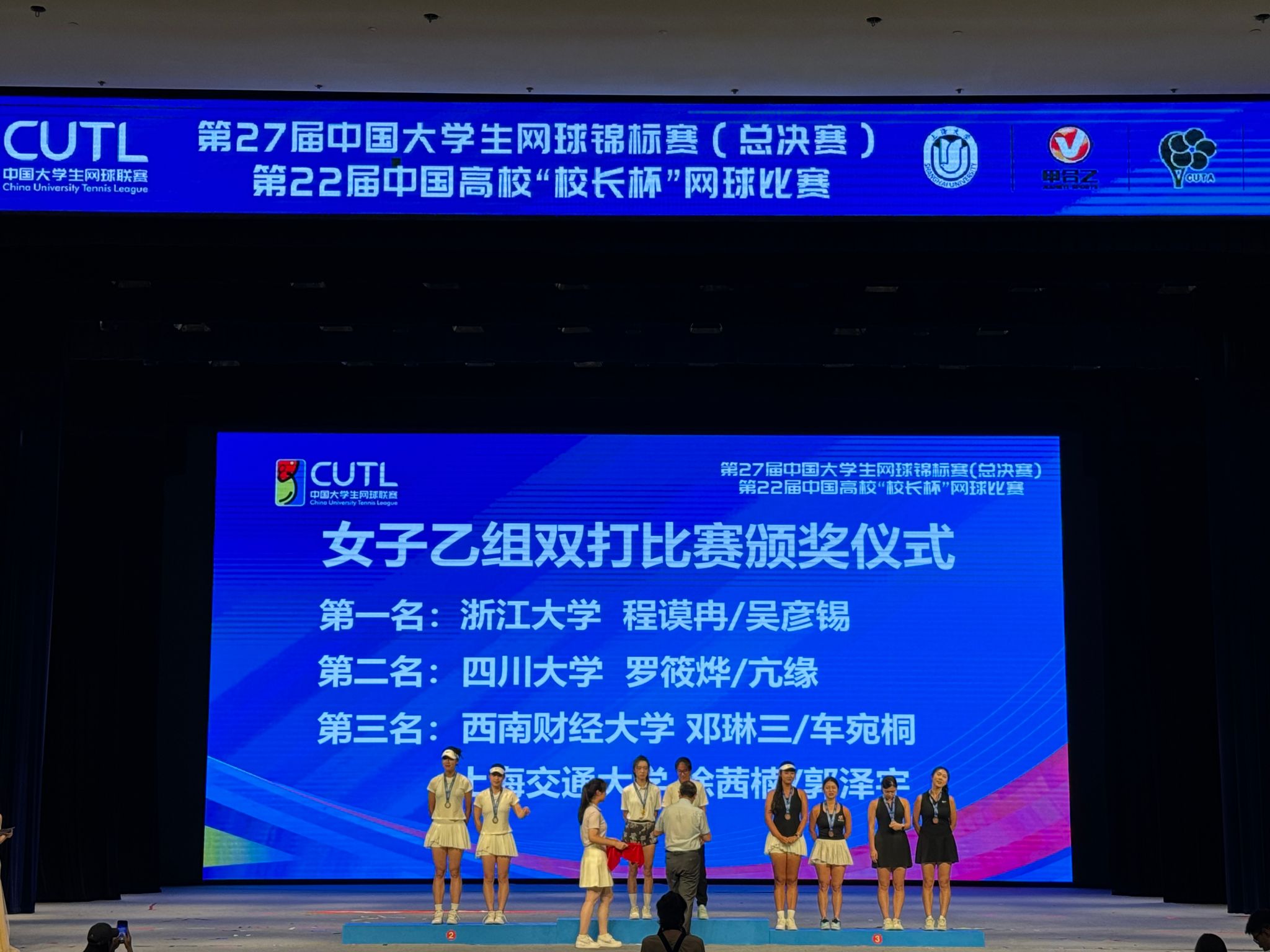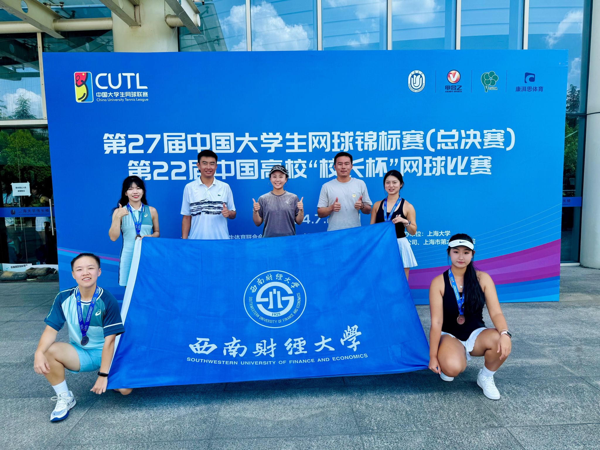 7月22日-8月1日,第27届中国大学生网球锦标赛(总决赛)在上海大学(宝山校区)举行。中国大学生网球锦标赛是我国大学生层面最顶级的网球赛事,经过八大分区赛的激烈角逐,在本届中国大学生网球锦标赛(总决赛)中,共有来自全国132所高校的915名同学成功晋级总决赛。参赛规模创历史新高!沙巴(中国)网球队在前期分区赛上表现突出,成功晋级总决赛,11名运动员代表学校参赛,孙巨杉、施泓宇、孔星宇担任教练。经过八天的激烈角逐,西财健儿们在强手如林的赛场上顽强拼搏,团结奋进,获得女子普通高校甲组双打季军和女子高水平乙组双打季军的好成绩,充分展现了西财学子的精神风貌和青春风采,为即将到来的西财百年华诞献礼!