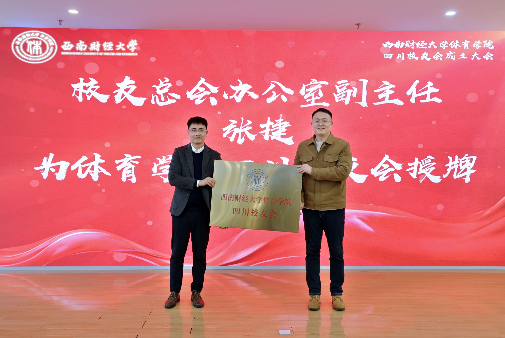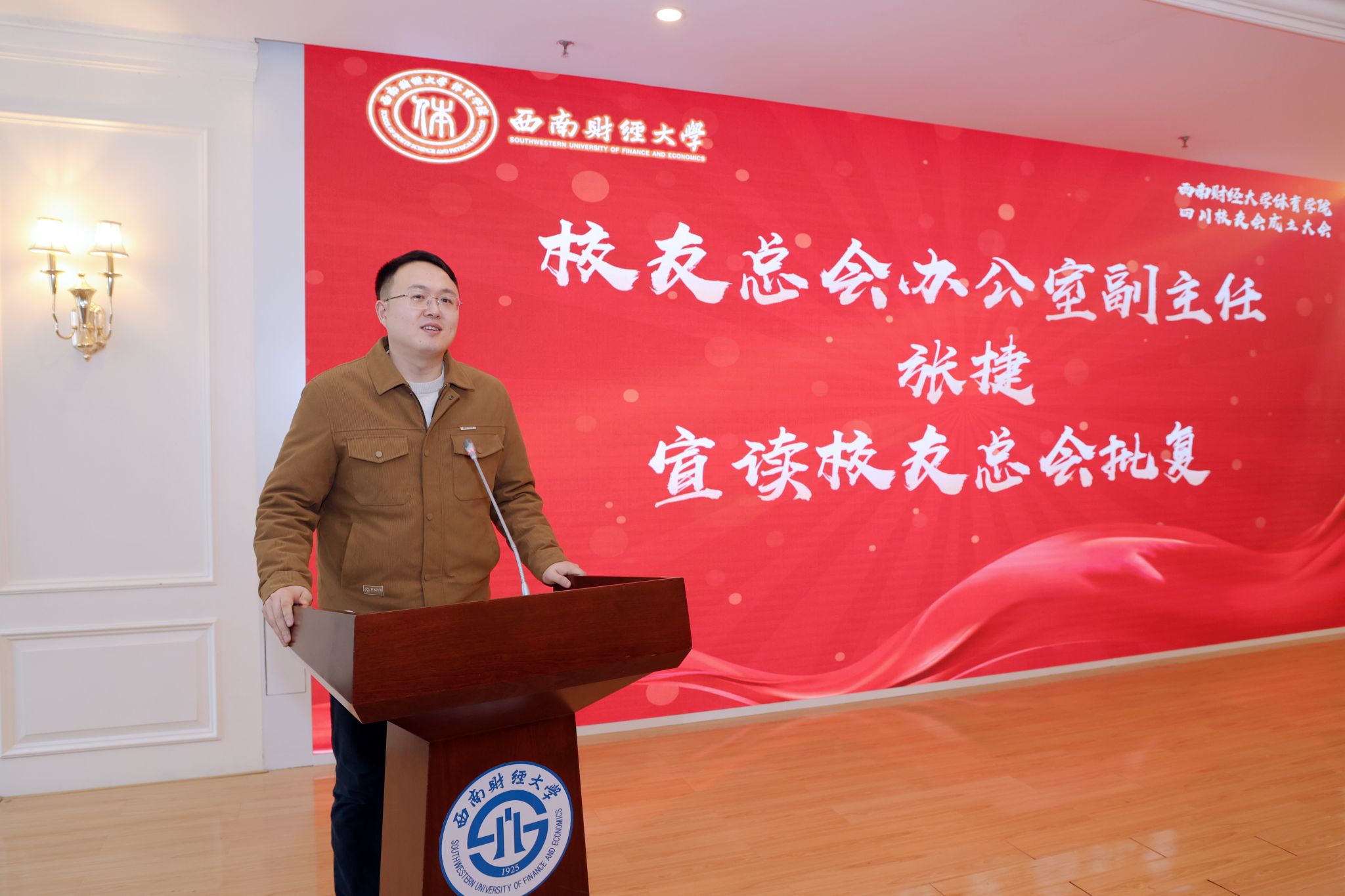 张捷宣读学校校友总会批复,为沙巴足球网四川校友会授牌,向沙巴足球网四川校友会的成立致以热烈祝贺。