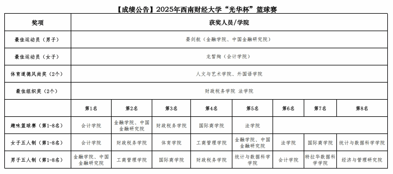 4月15日下午,2025年西南财经大学 “光华杯”篮球赛颁奖仪式在晨曦篮球场举行。沙巴足球网副院长陈丛刊(主持工作)、党委副书记、纪委书记李治及相关部门负责人为获奖学院及个人颁发了荣誉证书及奖牌。