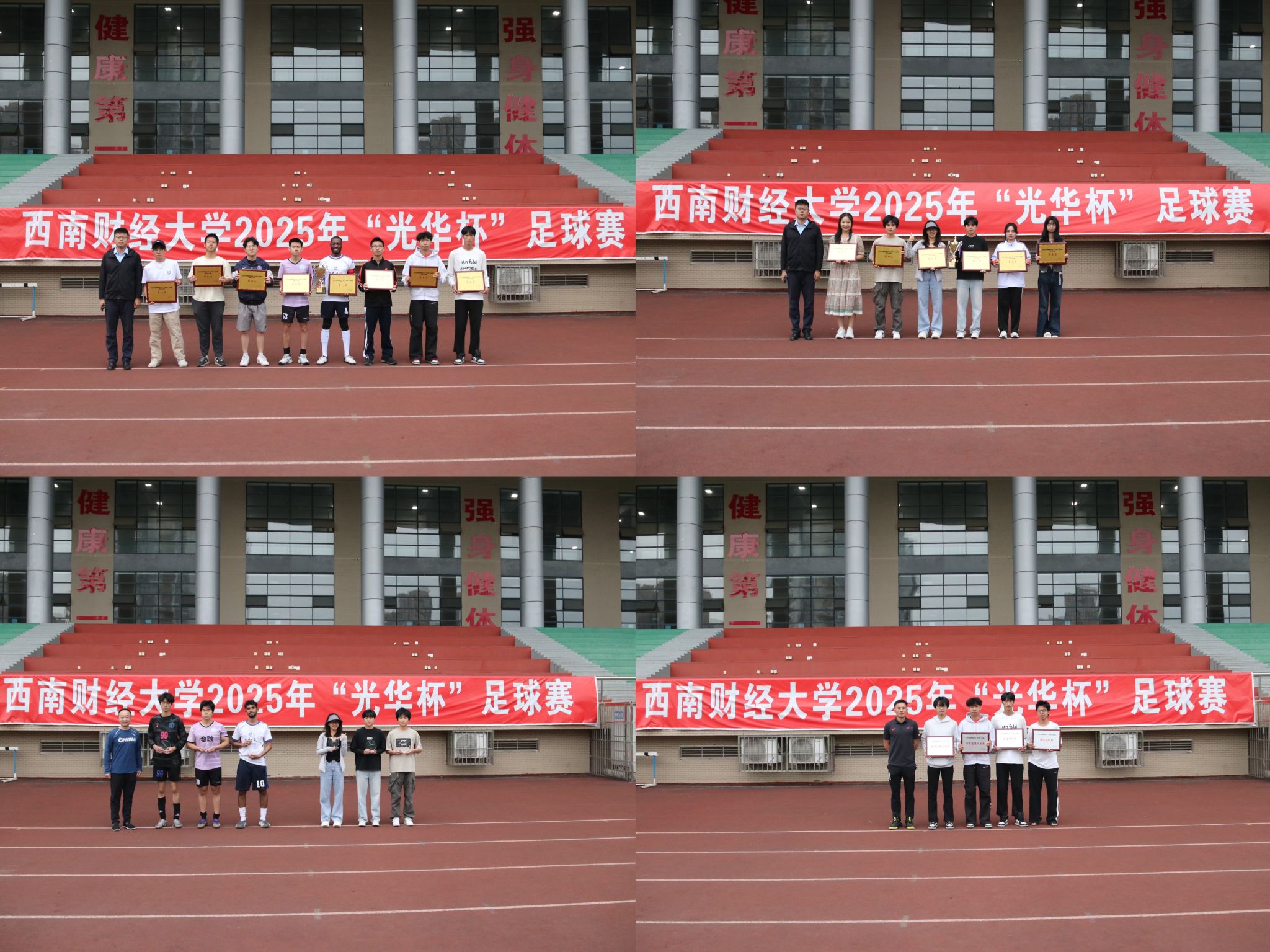 4月25日下午,2025年西南财经大学“光华杯”足球比赛颁奖仪式在晨曦足球场举行。沙巴足球网副院长陈丛刊(主持工作)、副院长阴涛、党委副书记李治及相关部门负责人亲临现场观赛,并为获奖个人与学院颁发荣誉证书及奖牌。