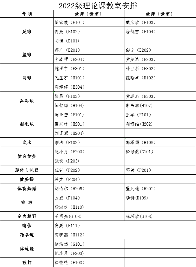各学院: 经教务处同意,本学期2022级本科生第1周体育课为沙巴(中国)理论课,9月18日起恢复户外教学。根据教室资源状况,现将理论课具体安排通知如下: