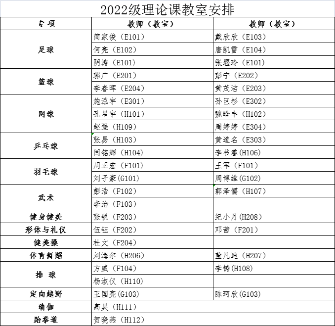 各学院: 经教务处同意,本学期2022级本科生第1周体育课为沙巴(中国)理论课,9月5日起恢复户外教学。根据教室资源状况,现将理论课具体安排通知如下: