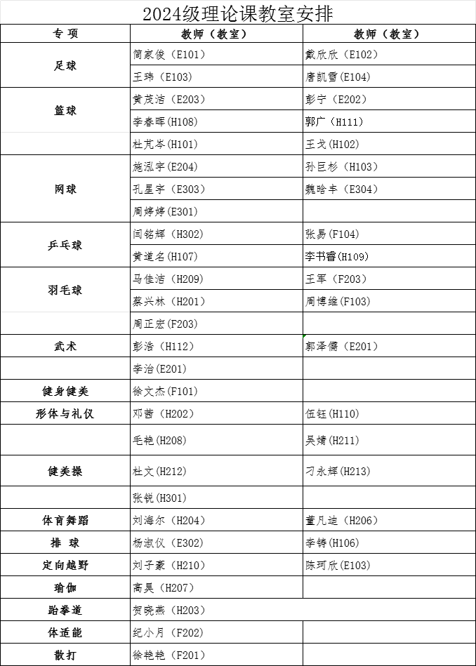 经教务处同意,本学期2024级本科生第1周体育课为沙巴(中国)理论课,9月15日起恢复户外教学。根据教室资源状况,现将理论课具体安排通知如下: