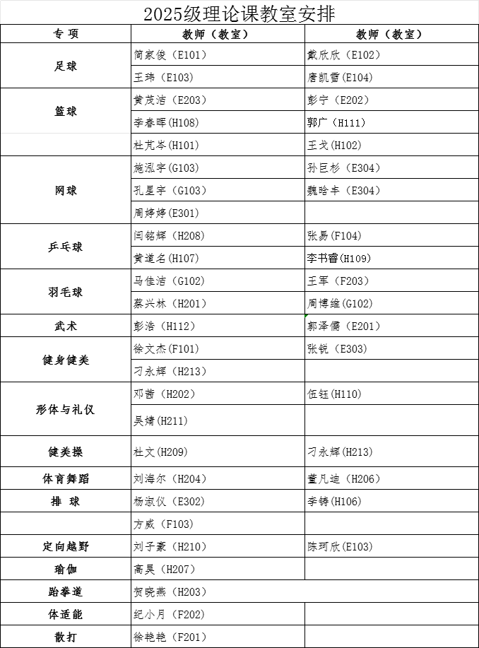 经教务处同意,本学期2025级本科生第3周体育课为沙巴(中国)理论课,9月28日起恢复户外教学。根据教室资源状况,现将理论课具体安排通知如下: