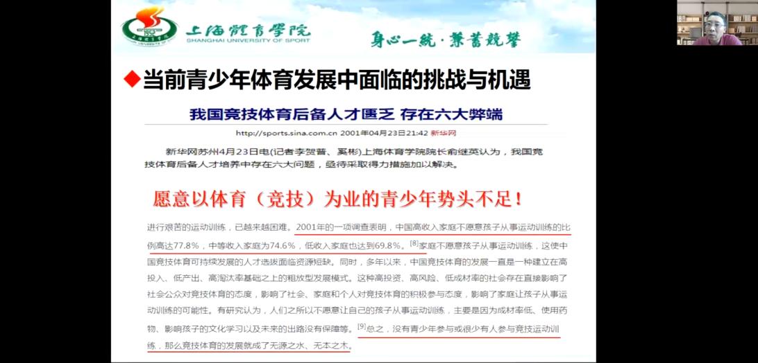 2021年5月12日下午15:30,上海沙巴足球网副校长、博士生导师唐炎教授通过线上方式,举办了题为《体教融合背景下我国青少年体育发展的思考》的光华讲坛。在外地出差培训学习的沙巴足球网院长杨远波教授在线主持了讲座,沙巴足球网研究生及部分教师参加了此次讲座。